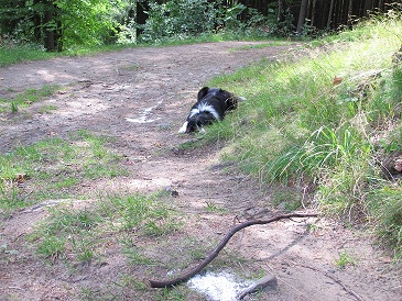 Eggiho baví spousta věcí.... například PASENÍ KLACKŮ....Nevím, jak jinak nazvat, když dlouhé minuty upřeným pohledem "pase" klacek a čeká, kdo mu ho hodí....A vůbec nejde o to hodit ledajaký klacek, ale ten jeho, ten, který si vybral.... pro něj je schopný vrhnout se i do roští a hledat a hledat.... Naše klackovaná má ovšem i svá úskalí a sice občas si plete aport s klackem a myslí si, že ten se taky nemusí nosit. Ale už se to lepší, pro kus žvance přinese i modré z nebe.... Když se daří, tak míčky i disky nosí až do ruky :-)...ale klacek? - ten ani náhodou....